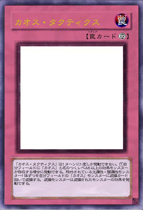 | 「カオス・タクティクス」は1ターンに1度しか発動できない。①自分フィールドに「カオス」と名のつくレベル5以上の効果モンスターが存在する場合に発動できる。除外されている光属性・闇属性モンスター1体ずつを自分フィールドの「カオス」モンスターに装備カード扱いで装備する。装備モンスターは装備されたモンスターの効果を発動できる。 | |||