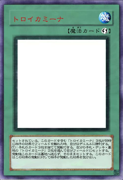 | セットされている、このカードを含む「トロイカミーナ」3枚が同時に相手の効果でフィールドを離れた時、自分はデュエルに勝利する。 ①:手札のカード3枚を捨てて発動できる。自分の手札・デッキ・墓地の「トロイカミーナ」2枚を選んで自分フィールドにセットする。発動後このカードは墓地へ送らず、そのままセットする。このカードはこの効果の発動に対して相手が発動した効果を受けない。 | |||
