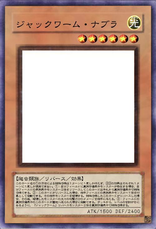 | このカード名の①の方法による特殊召喚は1ターンに1度しか行えず、②③の効果はそれぞれ1ターンに1度しか使用できない。①:自分フィールドに裏側守備表示モンスターが存在する場合、自分フィールドの表側表示モンスター2体をリリースしてこのカードは手札から裏側守備表示で特殊召喚できる。②:このカードがリバースした場合、相手フィールドの表側表示モンスター1体を対象として発動できる。その相手モンスターを破壊する。特殊召喚したこのカードがリバースした場合、その後、破壊したモンスターの元々の攻撃力分のダメージを相手に与える。③:フィールドの裏側守備表示のこのカードが墓地へ送られた場合に発動できる。デッキから、レベルの合計が6になるように、「ジャックワーム」リバースモンスター2体を裏側守備表示で特殊召喚する。 | |||