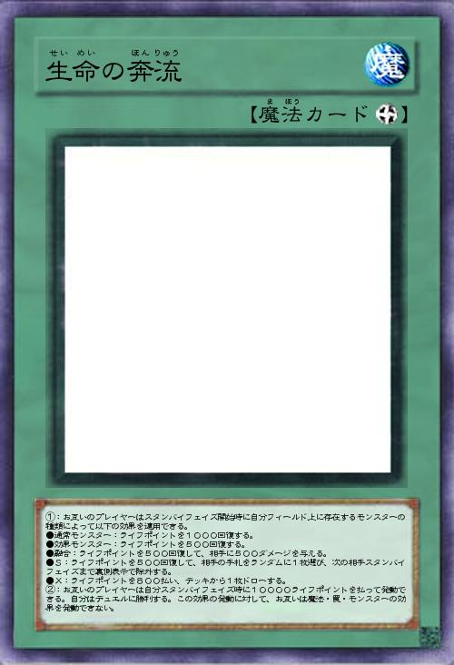 | ①:お互いのプレイヤーはスタンバイフェイズ開始時に自分フィールド上に存在するモンスターの種類によって以下の効果を適用できる。 ●通常モンスター:ライフポイントを1000回復する。 ●効果モンスター:ライフポイントを500回復する。 ●融合:ライフポイントを500回復して、相手に500ダメージを与える。 ●S:ライフポイントを500回復して、相手の手札をランダムに1枚選び、次の相手スタンバイフェイズまで裏側表示で除外する。 ●X:ライフポイントを800払い、デッキから1枚ドローする。 ②:お互いのプレイヤーは自分スタンバイフェイズ時に10000ライフポイントを払って発動できる。自分はデュエルに勝利する。この効果の発動に対して、お互いは魔法・罠・モンスターの効果を発動できない。 | |||