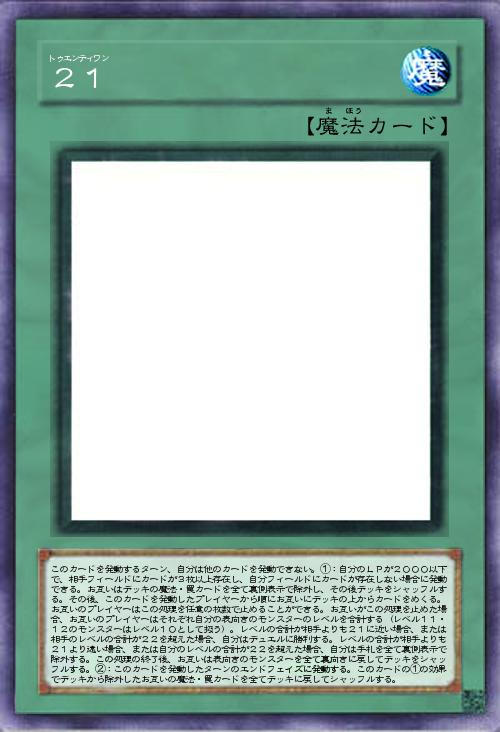 | このカードを発動するターン、自分は他のカードを発動できない。①:自分のLPが2000以下で、相手フィールドにカードが3枚以上存在し、自分フィールドにカードが存在しない場合に発動できる。お互いはデッキの魔法・罠カードを全て裏側表示で除外し、その後デッキをシャッフルする。その後、このカードを発動したプレイヤーから順にお互いにデッキの上からカードをめくる。お互いのプレイヤーはこの処理を任意の枚数で止めることができる。お互いがこの処理を止めた場合、お互いのプレイヤーはそれぞれ自分の表向きのモンスターのレベルを合計する(レベル11・12のモンスターはレベル10として扱う)。レベルの合計が相手よりも21に近い場合、または相手のレベルの合計が22を超えた場合、自分はデュエルに勝利する。レベルの合計が相手よりも21より遠い場合、または自分のレベルの合計が22を超えた場合、自分は手札を全て裏側表示で除外する | |||
