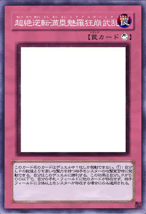 | このカード名のカードはデュエル中1枚しか発動できない。①:自分LPの数値よりも高い攻撃力を持つ相手モンスターの攻撃宣言時に発動できる。自分はこのデュエルに勝利する。この効果は自分LPが500以下で、自分の手札・フィールドに他のカードが存在せず、相手フィールドに3体以上モンスターが存在する場合にのみ適用される。 | |||