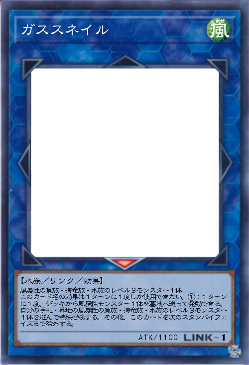 | 風属性の魚族・海竜族・水族のレベル3モンスター1体 このカード名の効果は1ターンに1度しか使用できない。①:1ターンに1度、デッキから風属性モンスター1体を墓地へ送って発動できる。自分の手札・墓地の風属性の魚族・海竜族・水族のレベル3モンスター1体を選んで特殊召喚する。その後、このカードを次のスタンバイフェイズまで除外する。 | |||