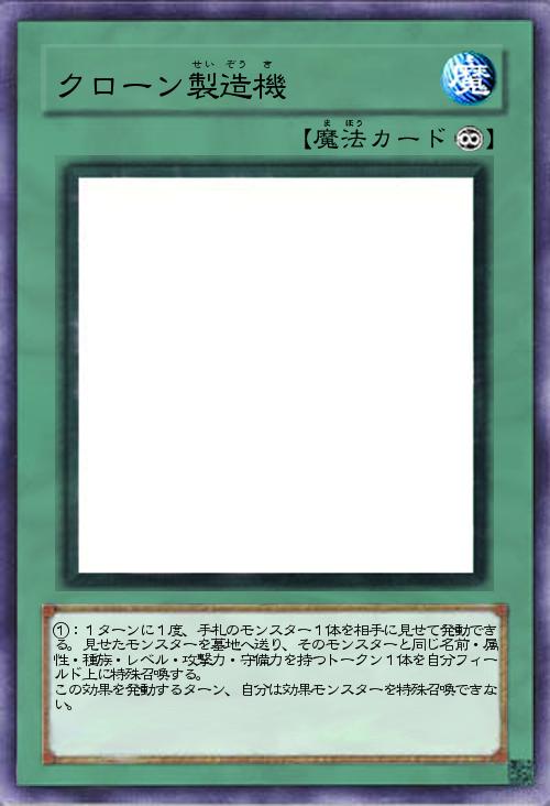| ①:1ターンに1度、手札のモンスター1体を相手に見せて発動できる。見せたモンスターを墓地へ送り、そのモンスターと同じ名前・属性・種族・レベル・攻撃力・守備力を持つトークン1体を自分フィールド上に特殊召喚する。 この効果を発動するターン、自分は効果モンスターを特殊召喚できない。 | |||