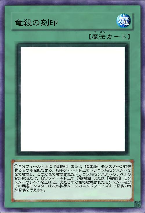 | ①自分フィールド上に『竜操姫』または『竜姫将』モンスターが存在する時のみ発動できる。相手フィールド上のドラゴン族モンスターを全て破壊し、この効果で破壊されたドラゴン族モンスターのレベルの合計数値だけ、自分フィールド上の『竜操姫』または『竜姫将』モンスターのレベルを上げる。またこの効果で破壊されたモンスター及びその同名モンスターは次の相手ターンのエンドフェイズまで召喚・特殊召喚を行えない。 | |||