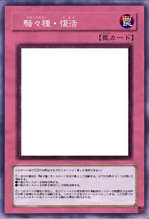 | このカード名の①②の効果はそれぞれ1ターンに1度しか使用できない。 ①:自分の墓地の「騒々種」モンスター1体を対象として発動する。以下の効果から1つを選んで適用する。 ●対象のモンスターを特殊召喚する。 ●対象のモンスターを効果を無効にして特殊召喚する。 ②:このカードが墓地に存在し、自分フィールドの表側表示の鳥獣族モンスターが戦闘または相手の効果で破壊された場合に発動できる。このカードを自分フィールドにセットする。この効果でセットしたこのカードはフィールドから離れた場合に除外される。 | |||