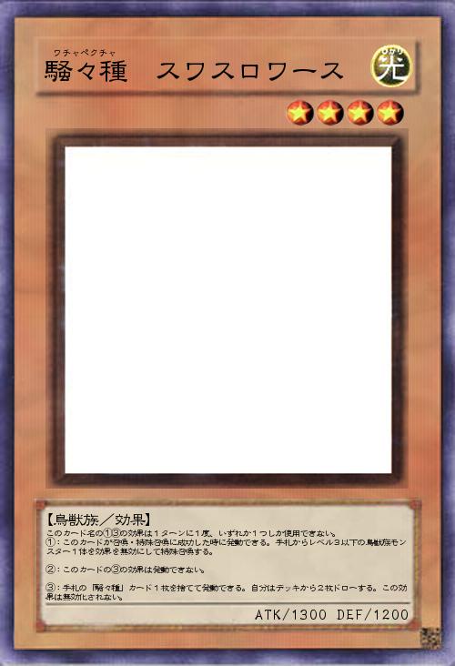 | このカード名の①③の効果は1ターンに1度、いずれか1つしか使用できない。 ①:このカードが召喚・特殊召喚に成功した時に発動できる。手札からレベル3以下の鳥獣族モンスター1体を効果を無効にして特殊召喚する。 ②:このカードの③の効果は発動できない。 ③:手札の「騒々種」カード1枚を捨てて発動できる。自分はデッキから2枚ドローする。この効果は無効化されない。 | |||