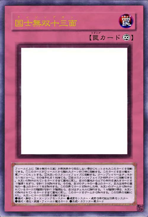 | フィールド上に「国士無双十三面」が表側表示で存在しない場合にセットされたこのカードを発動できる。①このカードがフィールドから離れたターン終了時に発動する。このカードを自分魔法・罠ゾーンにセットする。②お互いのスタンバイフェイズに発動する。ターンプレイヤーはデッキから1枚ドローし、その後手札を1枚捨てる。③自分スタンバイフェイズか相手ターンに発動できる。お互いの除外されているカードを全て墓地に戻し、自分の墓地から以下の条件を満たすカードを1種類1枚ずつ、合計13枚除外する。その後、自分のデッキの一番上のカード、または相手の墓地の一番上のカード1枚を除外する。この効果でカードを除外した時、お互いのゲームから除外されているカードの種類が合計13種類なら、自分はデュエルに勝利する。14種類の場合、お互いの除外されているカードを全て墓地に戻し、このカードをゲームから除外する。この効果の発動に対し、お | |||