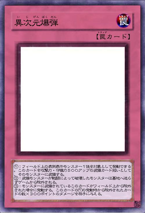 | ①:フィールド上の表側表示モンスター1体を対象として発動できる。このカードを攻撃力・守備力500アップの装備カード扱いとして、そのモンスターに装備する。 ②:装備モンスターが戦闘によって破壊したモンスターは墓地へ送らずゲームから除外される。 ③:モンスターに装備されているこのカードがフィールド上から除外された場合に発動する。このカードの①の発動時から除外されたカードの数×300ポイントのダメージを相手に与える。 | |||