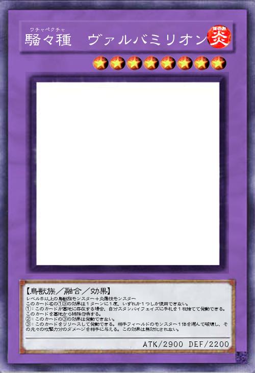 | レベル5以上の鳥獣族モンスター+炎属性モンスター このカード名の①③の効果は1ターンに1度、いずれか1つしか使用できない。 ①:このカードが墓地に存在する場合、自分スタンバイフェイズに手札を1枚捨てて発動できる。このカードを墓地から特殊召喚する。 ②:このカードの③の効果は発動できない。 ③:このカードをリリースして発動できる。相手フィールドのモンスター1体を選んで破壊し、その元々の攻撃力分のダメージを相手に与える。この効果は無効化されない。 | |||
