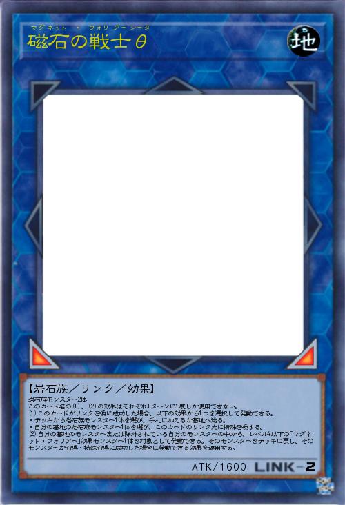 | 岩石族モンスター2体 このカード名の(1)、(2)の効果はそれぞれ1ターンに1度しか使用できない。 (1)このカードがリンク召喚に成功した場合、以下の効果から1つを選択して発動できる。 ・デッキから岩石族モンスター1体を選び、手札に加えるか墓地へ送る。 ・自分の墓地の岩石族モンスター1体を選び、このカードのリンク先に特殊召喚する。 (2)自分の墓地のモンスターまたは除外されている自分のモンスターの中から、レベル4以下の「マグネット・ウォリアー」効果モンスター1体を対象として発動できる。そのモンスターをデッキに戻し、そのモンスターが召喚・特殊召喚に成功した場合に発動できる効果を適用する。 | |||