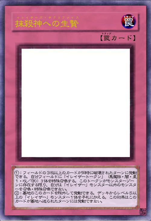 | ①:フィールドの3枚以上のカードが同時に破壊されたターンに発動できる。自分フィールドに「イレイザートークン」(悪魔族・闇・星1・攻/守0)3体を特殊召喚する。このトークンがモンスターゾーンに存在する限り、自分は「イレイザー」モンスター以外のモンスターを召喚・特殊召喚できない。 ②:墓地のこのカードを除外して発動できる。デッキからレベル5以上の「イレイザー」モンスター1体を手札に加える。この効果はこのカードが墓地へ送られたターンには発動できない。 | |||