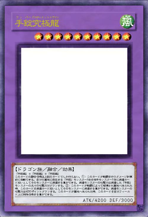 | 「手錠龍」+「手錠龍」+「手錠龍」 このカードの融合召喚は上記のカードでしか行えない。①:このカードが戦闘を行うダメージ計算前に発動できる。自分の墓地に存在する「手錠」モンスター1体を相手モンスター1体に装備カード扱いとしてそのモンスターに装備する事ができる。装備モンスターの攻撃力は装備した「手錠」モンスターの元々の攻撃力分ダウンする。②:このカードが戦闘によって破壊され墓地へ送られた時、このカードを装備カード扱いとしてそのモンスターに装備する事ができる。装備モンスターの攻撃力は4200ポイントダウンする。このカードが墓地へ送られた時、このカードを自分フィールド上に特殊召喚する事ができる。 | |||