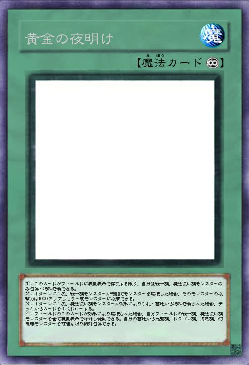 | ①:このカードがフィールドに表側表示で存在する限り、自分は戦士族、魔法使い族モンスターのみ召喚・特殊召喚できる。 ②:1ターンに1度、戦士族モンスターが戦闘でモンスターを破壊した場合、そのモンスターの攻撃力は1000アップしもう一度モンスターに攻撃できる。 ③:1ターンに1度、魔法使い族モンスターが効果により手札・墓地から特殊召喚された場合、デッキからカードを1枚ドローする。 ④:フィールドのこのカードが効果により破壊された場合、自分フィールドの戦士族、魔法使い族モンスターを全て裏側表示で除外し発動できる。自分の墓地から悪魔族、ドラゴン族、海竜族、幻竜族モンスターを可能な限り特殊召喚できる。 | |||