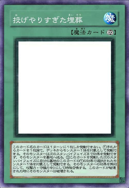 | このカード名のカードは1ターンに1枚しか発動できない。①手札からカードを1枚捨て、デッキからモンスター1体を対象として発動できる。そのモンスターは次のスタンバイフェイズまで効果を発動できず、そのモンスターを墓地へ送る。②このカードを発動した次のスタンバイフェイズに自分の墓地のこのカードの①の効果で選択されたモンスター1体を対象として発動できる。そのモンスターの効果を無効にして、攻撃力・守備力を0にして特殊召喚する。このカードが破壊された時にそのモンスターは破壊される。 | |||