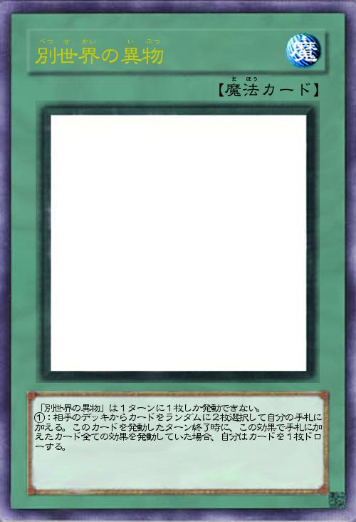 | 「別世界の異物」は1ターンに1枚しか発動できない。 ①:相手のデッキからカードをランダムに2枚選択して自分の手札に加える。このカードを発動したターン終了時に、この効果で手札に加えたカード全ての効果を発動していた場合、自分はカードを1枚ドローする。 | |||