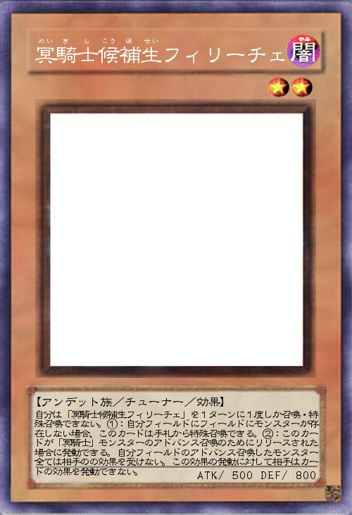 | 自分は「冥騎士候補生フィリーチェ」を1ターンに1度しか召喚・特殊召喚できない。①:自分フィールドにフィールドにモンスターが存在しない場合、このカードは手札から特殊召喚できる。②:このカードが「冥騎士」モンスターのアドバンス召喚のためにリリースされた場合に発動できる。自分フィールドのアドバンス召喚したモンスター全ては相手のの効果を受けない。この効果の発動に対して相手はカードの効果を発動できない。 | |||