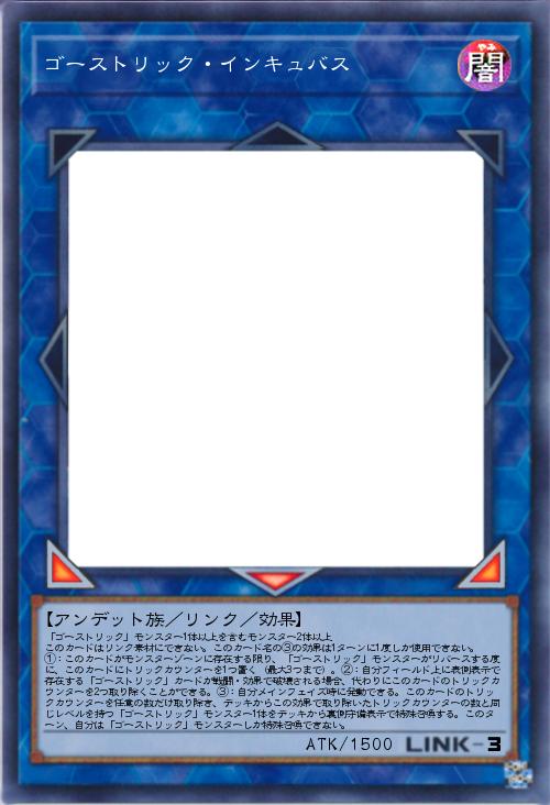 | 「ゴーストリック」モンスター1体以上を含むモンスター2体以上 このカードはリンク素材にできない。このカード名の③の効果は1ターンに1度しか使用できない。 ①:このカードがモンスターゾーンに存在する限り、「ゴーストリック」モンスターがリバースする度に、このカードにトリックカウンターを1つ置く(最大3つまで)。②:自分フィールド上に表側表示で存在する「ゴーストリック」カードが戦闘・効果で破壊される場合、代わりにこのカードのトリックカウンターを2つ取り除くことができる。③:自分メインフェイズ時に発動できる。このカードのトリックカウンターを任意の数だけ取り除き、デッキからこの効果で取り除いたトリックカウンターの数と同じレベルを持つ「ゴーストリック」モンスター1体をデッキから裏側守備表示で特殊召喚する。このターン、自分は「ゴーストリック」モンスターしか特殊召喚できない。 | |||