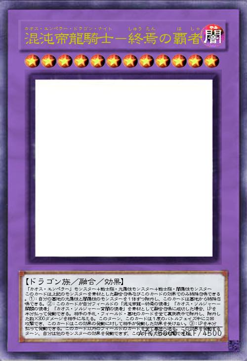 「混沌帝龍の融合体。素材はカオス・エンペラーと光闇の戦士族。なので終焉龍の方も同名カードも素材にできます。