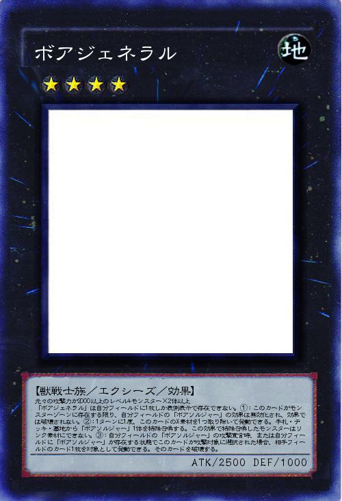 | 元々の攻撃力が2000以上のレベル4モンスター×2体以上 「ボアジェネラル」は自分フィールドに1枚しか表側表示で存在できない。①:このカードがモンスターゾーンに存在する限り、自分フィールドの「ボアソルジャー」の効果は無効化され、効果では破壊されない。②:1ターンに1度、このカードのX素材を1つ取り除いて発動できる。手札・デッキ・墓地から「ボアソルジャー」1体を特殊召喚する。この効果で特殊召喚したモンスターはリンク素材にできない。③:自分フィールドの「ボアソルジャー」の攻撃宣言時、または自分フィールドに「ボアソルジャー」が存在する状態でこのカードが攻撃対象に選択された場合、相手フィールドのカード1枚を対象として発動できる。そのカードを破壊する。 | |||