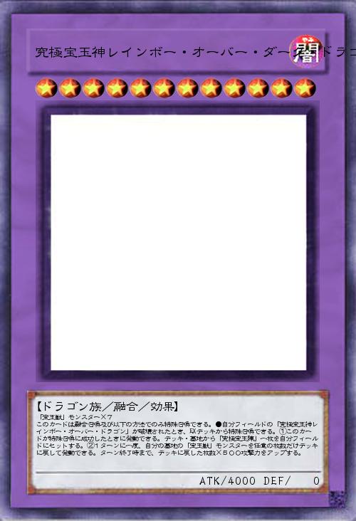 | 「宝玉獣」モンスター×7 このカードは融合召喚及び以下の方法でのみ特殊召喚できる。●自分フィールドの「究極宝玉神レインボー・オーバー・ドラゴン」が破壊されたとき、EXデッキから特殊召喚できる。①このカードが特殊召喚に成功したときに発動できる。デッキ・墓地から「究極宝玉陣」一枚を自分フィールドにセットする。②1ターンに一度、自分の墓地の「宝玉獣」モンスターを任意の枚数だけデッキに戻して発動できる。ターン終了時まで、デッキに戻した枚数×500攻撃力をアップする。 | |||