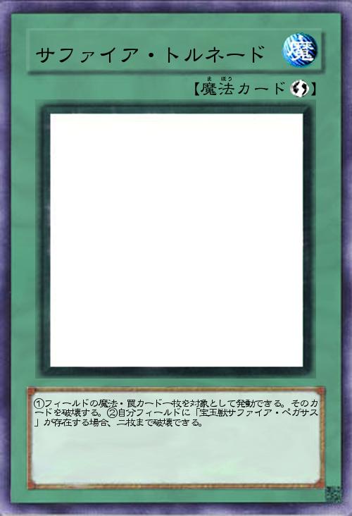 「サファイア・ペガサスの攻撃名をカードにしました。単なるサイクロンなのですが、サファイア・ペガサスがいる状況で使うと二枚破壊できるというもの。」(2019-01-09 11:49)