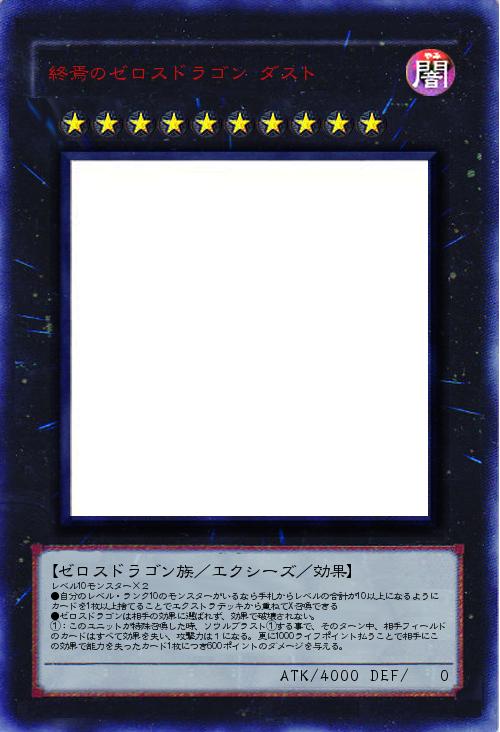 | レベル10モンスター×2 ●自分のレベル・ランク10のモンスターがいるなら手札からレベルの合計が10以上になるようにカードを1枚以上捨てることでエクストラデッキから重ねてX召喚できる ●ゼロスドラゴンは相手の効果に選ばれず、効果で破壊されない。 ①:このユニットが特殊召喚した時、ソウルブラスト①する事で、そのターン中、相手フィールドのカードはすべて効果を失い、攻撃力は1になる。更に1000ライフポイント払うことで相手にこの効果で能力を失ったカード1枚につき600ポイントのダメージを与える。 | |||