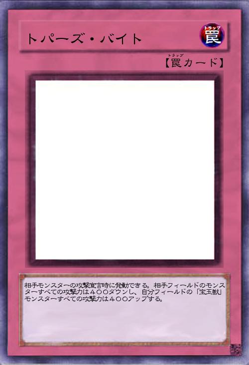 | 相手モンスターの攻撃宣言時に発動できる。相手フィールドのモンスターすべての攻撃力は400ダウンし、自分フィールドの「宝玉獣」モンスターすべての攻撃力は400アップする。 | |||