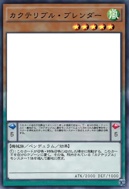 P効果に融合効果を保持しており、タン1で手札・フィールド・墓地から素材をデッキに戻して融合が出来ます。モンスター効果は召喚・SS時に強制でPゾーンへ移行。おまけで除外されたカクテリブル1体を墓地に戻すことが出来ます。上級なので、なかなかモンスター効果を使う機会はなさそうですかね。