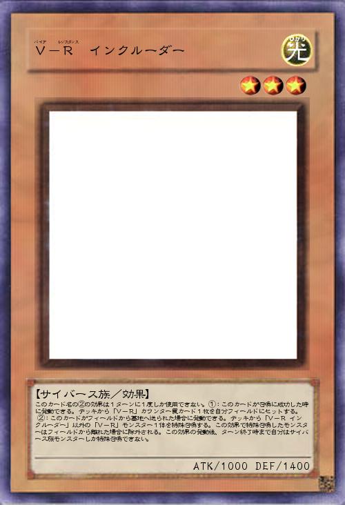 | このカード名の②の効果は1ターンに1度しか使用できない。①:このカードが召喚に成功した時に発動できる。デッキから「V-R」カウンター罠カード1枚を自分フィールドにセットする。 ②:このカードがフィールドから墓地へ送られた場合に発動できる。デッキから「V-R インクルーダー」以外の「V-R」モンスター1体を特殊召喚する。この効果で特殊召喚したモンスターはフィールドから離れた場合に除外される。この効果の発動後、ターン終了時まで自分はサイバース族モンスターしか特殊召喚できない。 | |||