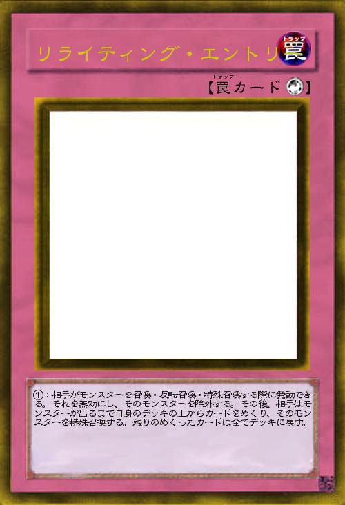 | ①:相手がモンスターを召喚・反転召喚・特殊召喚する際に発動できる。それを無効にし、そのモンスターを除外する。その後、相手はモンスターが出るまで自身のデッキの上からカードをめくり、そのモンスターを特殊召喚する。残りのめくったカードは全てデッキに戻す。 | |||