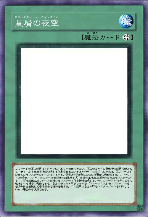| このカードの③の効果は1ターンに1度しか使用できない。①このカードの発動時の効果処理として、デッキから自身を特殊召喚する効果を含まないチューナー1体を手札に加える。②フィールドの全てのモンスターのレベルは1下がる。③自分がS召喚に成功した場合に発動できる。フィールド上のSモンスター1体のレベルを任意の数値分下げ、自分の墓地または除外されたモンスターから、下げた数値と同じレベルを持つモンスター1体を特殊召喚する。④このカードが相手によって破壊された場合に発動できる。自分のデッキ・EXデッキから「スターダスト」モンスター1体を召喚条件を無視して守備表示で特殊召喚する。この効果は自分がEXモンスターゾーンを利用していない場合のみ使用できる。 | |||