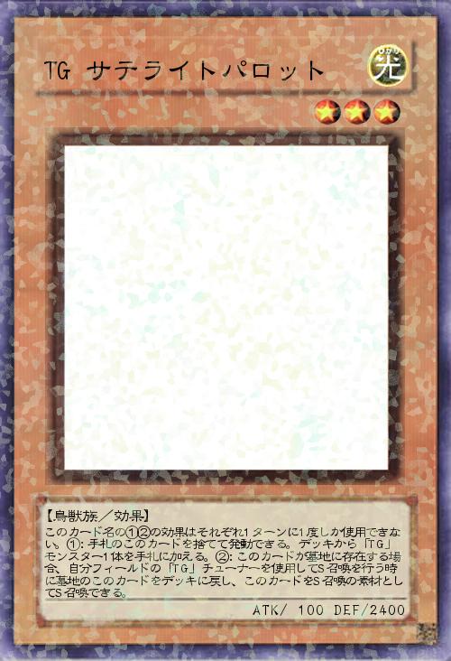 | このカード名の①②の効果はそれぞれ1ターンに1度しか使用できない。①:手札のこのカードを捨てて発動できる。デッキから「TG」モンスター1体を手札に加える。②:このカードが墓地に存在する場合、自分フィールドの「TG」チューナーを使用してS召喚を行う時に墓地のこのカードをデッキに戻し、このカードをS召喚の素材としてS召喚できる。 | |||