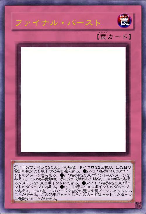 | ①:自分のライフが300以下の場合、サイコロを2回振り、出た目の合計の数により以下の効果を適応する。●2~6:相手に1000ポイントのダメージを与える。●7:相手に2000ポイントのダメージを与える。この効果発動時、手札を7枚除外した場合、この効果で与えるダメージを4000ポイントにできる。●8~11:相手に2000ポイントのダメージを与える。●12:相手に1000ポイントのダメージを与える。その後、このカードを自分の魔法&罠ゾーンにセットすることができる。この効果でセットしたこのカードはセットしたターンに発動することができる。 | |||