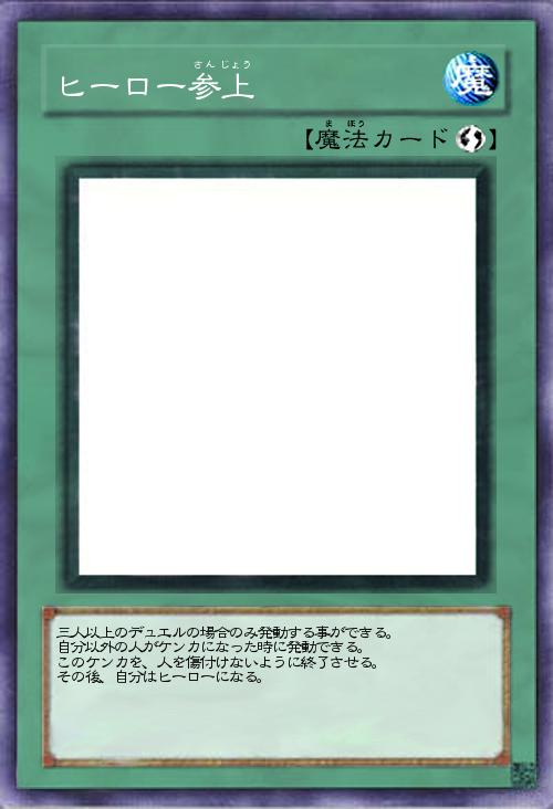 三人以上のデュエルの場合のみ発動する事ができる。 自分以外の人がケンカになった時に発動できる。 このケンカを、人を傷付けないように終了させる。 その後、自分はヒーローになる。 |