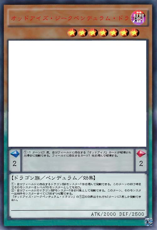 | ①:1ターンに1度、自分フィールドに存在する「オッドアイズ」カードが破壊された場合に発動できる。フィールドに存在するカード1枚を選んで破壊する。 | |||