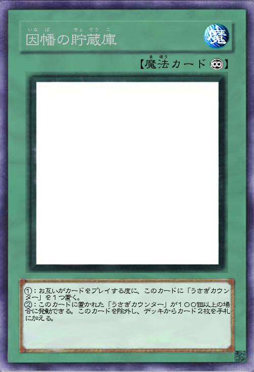 | ①:お互いがカードをプレイする度に、このカードに「うさぎカウンター」を1つ置く。 ②:このカードに置かれた「うさぎカウンター」が100個以上の場合に発動できる。このカードを除外し、デッキからカード2枚を手札に加える。 | |||