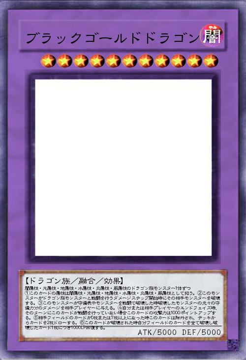 | 闇属性・光属性・地属性・水属性・炎属性・風属性のドラゴン族モンスター1体ずつ ①このカードの属性は闇属性・光属性・地属性・水属性・炎属性・風属性として扱う。②このモンスターがドラゴン族モンスターと戦闘を行うダメージステップ開始時にその相手モンスターを破壊する。③このモンスターが守備表示モンスターを戦闘で破壊した時破壊したモンスターの元々の守備力分のダメージを相手プレイヤーに与える。④自分または相手プレイヤーのエンドフェイズ時、そのターンにこのカードが戦闘を行っていない場合このカードの攻撃力は1000ポイントアップする。⑤相手フィールドのカードが0枚または7枚以上になった時このカードは除外され、デッキからカードを2枚ドローする。⑥このカードが破壊された時自分フィールドのカードを全て破壊し破壊したカード1枚につき1000LP回復する。 | |||