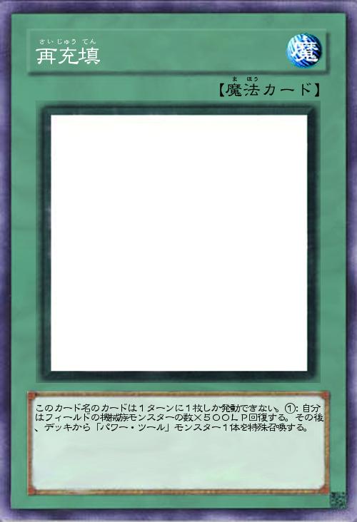 | このカード名のカードは1ターンに1枚しか発動できない。①:自分はフィールドの機械族モンスターの数×500LP回復する。その後、デッキから「パワー・ツール」モンスター1体を特殊召喚する。 | |||
