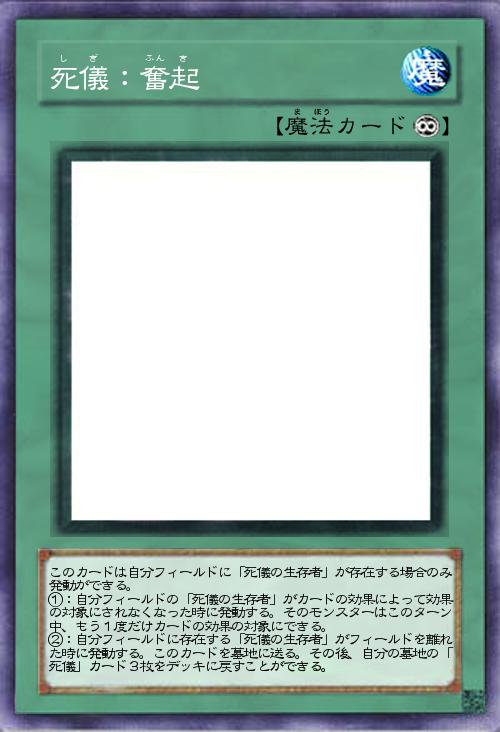 | このカードは自分フィールドに「死儀の生存者」が存在する場合のみ発動ができる。 ①:自分フィールドの「死儀の生存者」がカードの効果によって効果の対象にされなくなった時に発動する。そのモンスターはこのターン中、もう1度だけカードの効果の対象にできる。 ②:自分フィールドに存在する「死儀の生存者」がフィールドを離れた時に発動する。このカードを墓地に送る。その後、自分の墓地の「死儀」カード3枚をデッキに戻すことができる。 | |||