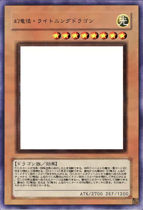 | ①このカードが召喚・特殊召喚に成功したとき発動できる。相手フィールドの魔法・罠カードを2枚まで選択して破壊する。②1ターンに1度まで発動できる。墓地から光属性の「幻竜子」と名のつくドラゴン族モンスター1体を手札に加える。④このカードがフィールドから墓地へ送られた時デッキから「幻竜怪」と名のつく光属性以外のドラゴン族モンスター1体を選択して手札に加える。⑤この効果は墓地へ送られたターンには発動できない。墓地のこのカードを除外して発動できる。墓地の「幻竜怪」または「幻竜子」と名のつくカードを5枚選択してデッキに戻す。その後デッキからカードを2枚ドローする。 | |||
