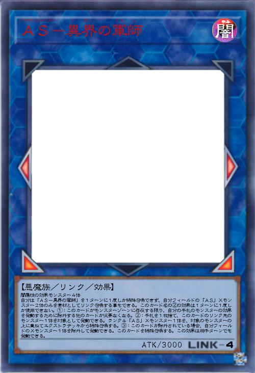 | 闇属性の効果モンスター4体 自分は「AS-異界の軍師」を1ターンに1度しか特殊召喚できず、自分フィールドの「AS」Xモンスター2体のみを素材としてリンク召喚する事もできる。このカード名の②の効果は1ターンに1度しか使用できない。①:このカードがモンスターゾーンに存在する限り、自分の手札のモンスターの効果を発動するために除外する他のカードが必要なくなる。②:手札を1枚捨て、このカードのリンク先のモンスター1体を対象として発動できる。ランク4「AS」Xモンスター1体を、対象のモンスターの上に重ねてエクストラデッキから特殊召喚する。③:このカードが除外されている場合、自分フィールドのXモンスター1体を除外して発動できる。このカードを特殊召喚する。この効果は相手ターンでも発動できる。 | |||