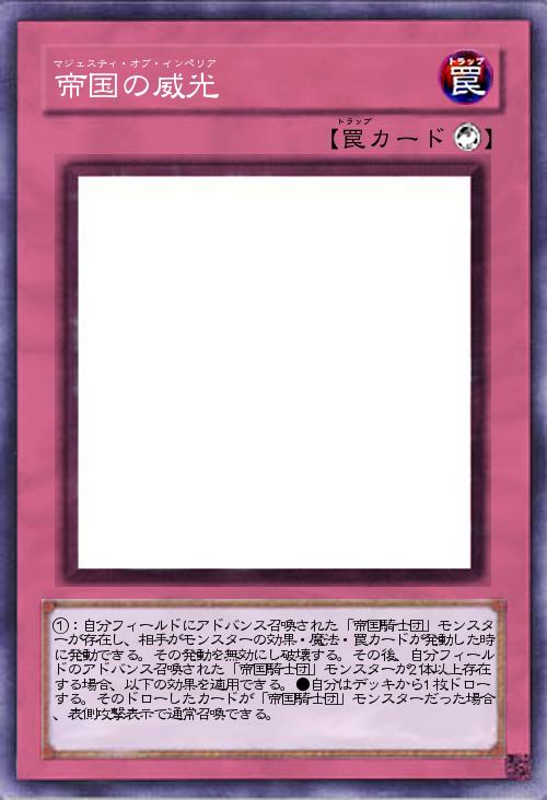 | ①:自分フィールドにアドバンス召喚された「帝国騎士団」モンスターが存在し、相手がモンスターの効果・魔法・罠カードが発動した時に発動できる。その発動を無効にし破壊する。その後、自分フィールドのアドバンス召喚された「帝国騎士団」モンスターが2体以上存在する場合、以下の効果を適用できる。●自分はデッキから1枚ドローする。そのドローしたカードが「帝国騎士団」モンスターだった場合、表側攻撃表示で通常召喚できる。 | |||