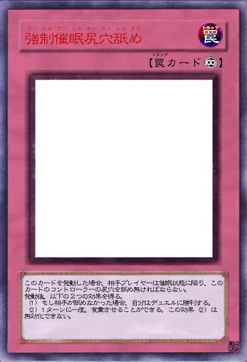 | このカードを発動した場合、相手プレイヤーは催眠状態に陥り、このカードのコントローラーの尻穴を舐め無ければならない。 発動後、以下の2つの効果を得る。 (1)もし相手が舐めなかった場合、自分はデュエルに勝利する。 (2)1ターンに一度、食糞させることができる。この効果(2)は無効化できない。 | |||