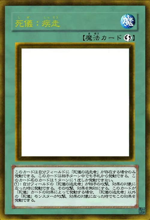 | このカードは自分フィールドに「死儀の逃走者」が存在する場合のみ発動できる。このカードは相手ターン中でも手札から発動できる。このカード名のカードは1ターンに1度しか発動できない。 ①:自分フィールドの「死儀の逃走者」が相手の攻撃、効果の対象になった時に発動できる。その攻撃、効果を無効にする。このカードが「死儀」カードの効果によって発動する場合、「死儀の逃走者」以外の「死儀」モンスターが攻撃、効果の対象になった時でもこの効果を発動できる。 | |||