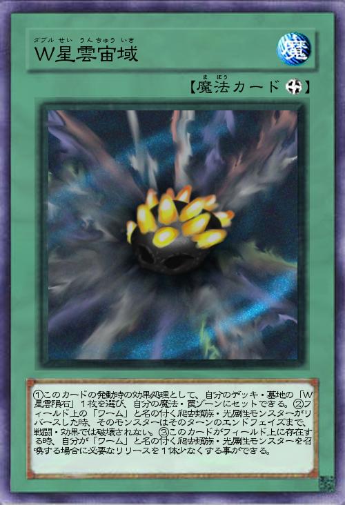 | ①このカードの発動時の効果処理として、自分のデッキ・墓地の「W星雲隕石」1枚を選び、自分の魔法・罠ゾーンにセットできる。②フィールド上の「ワーム」と名の付く爬虫類族・光属性モンスターがリバースした時、そのモンスターはそのターンのエンドフェイズまで、戦闘・効果では破壊されない。③このカードがフィールド上に存在する時、自分が「ワーム」と名の付く爬虫類族・光属性モンスターを召喚する場合に必要なリリースを1体少なくする事ができる。 | |||