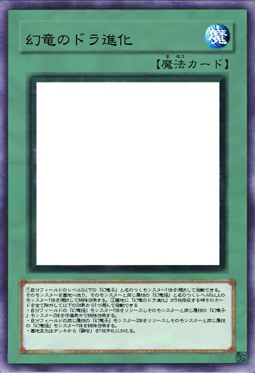 | ①自分フィールドのレベル2以下の「幻竜子」と名のつくモンスター1体を選択して発動できる。そのモンスターを墓地へ送り、そのモンスターと同じ属性の「幻竜怪」と名のつくレベル8以上のモンスター1体を選択して特殊召喚する。②墓地に「幻竜のドラ進化」が3枚存在する時そのカードを全て除外して以下の効果から1つ選んで発動できる ・自分フィールドの「幻竜怪」モンスター1体をリリースしそのモンスターと同じ属性の「幻竜子」モンスター2体を守備表示で特殊召喚する。 ・自分フィールドの同じ属性の「幻竜子」モンスター2体をリリースしそのモンスターと同じ属性の「幻竜怪」モンスター1体を特殊召喚する。 ・墓地またはデッキから「融合」を1枚手札に加える。 | |||