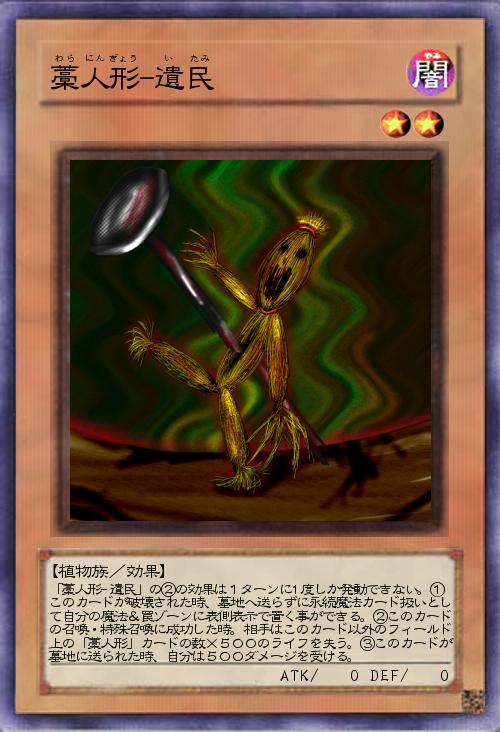 | 「藁人形-遺民」の②の効果は1ターンに1度しか発動できない。①このカードが破壊された時、墓地へ送らずに永続魔法カード扱いとして自分の魔法&罠ゾーンに表側表示で置く事ができる。②このカードの召喚・特殊召喚に成功した時。相手はこのカード以外のフィールド上の「藁人形」カードの数×500のライフを失う。③このカードが墓地に送られた時、自分は500ダメージを受ける。 | |||