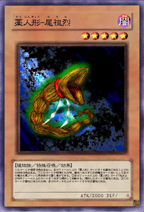 | このカードが通常召喚出来ない。自分フィールド上の「藁人形」カードを1枚墓地に送ることでのみ特殊召喚出来る。①このカードが破壊された時、墓地へ送らずに永続魔法カード扱いとして自分の魔法&罠ゾーンに表側表示で置く事ができる。②自分フィールド上の「藁人形」カード1枚および相手フィールド上のカードを1枚ずつ選択して発動する。選択したカードを墓地に送る。③このカードが墓地に送られた時、自分のデッキの上からカードを5枚を墓地に送る。 | |||