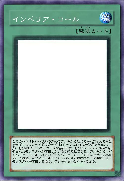 | このカードはドロー以外の方法でデッキから効果で手札に加える事はできず、このカード名のカードは1ターンに1枚しか使用できない。 ①:自分のEXデッキにカードが存在せず、自分フィールドに特殊召喚されたモンスターが存在しない場合に発動できる。デッキから「インペリア・コール」以外の「インペリア」カードを選んで手札に加える。その後、自分フィールドにアドバンス召喚された「帝国騎士団」モンスターが存在する場合、デッキから1枚ドローできる。 | |||